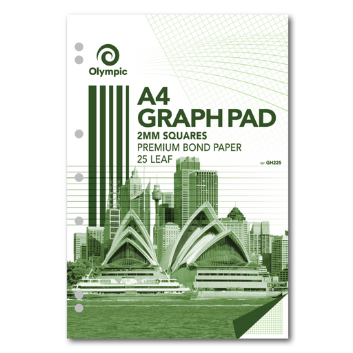 No reviewsOriginal price $9.95Current price $4.95| /Olympic A4 Graph Pad 5 mm Grid 25‑Sheet is a top-bound pad featuring 25 sheets of premium 80 gsm (sometimes listed as 70 gsm) white bond paper, eac...